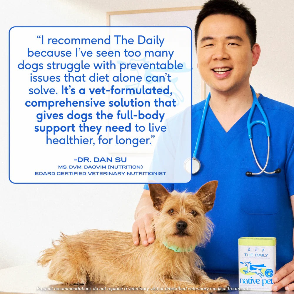 Because nobody likes runny poops or upset tummies! The Daily features our proprietary probiotic formula and pumpkin to help aid digestion, regulate bacteria, and support healthy bowel movements.